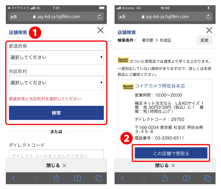 店舗を確認し、❷「この店舗で受取る」ボタンをタップ。