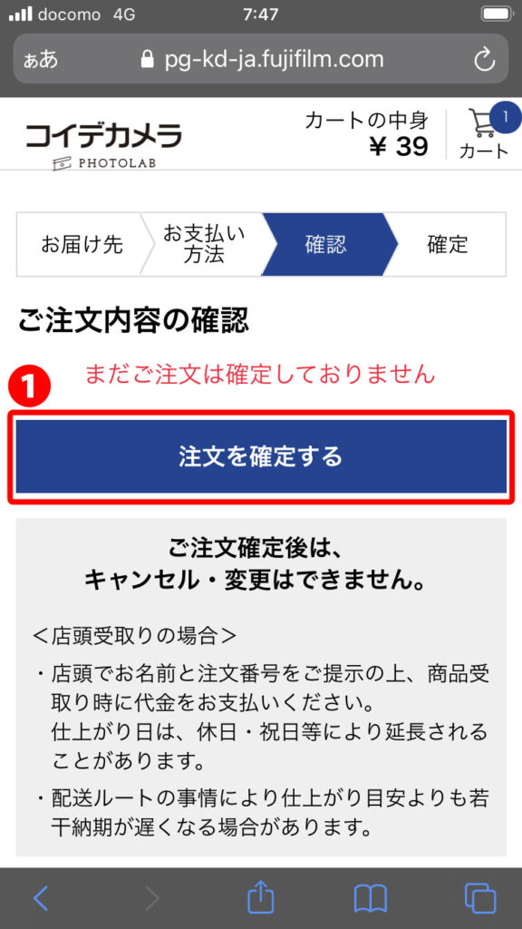 ご注文内容を確認後、❶「注文を確定する」ボタンをタップ。
