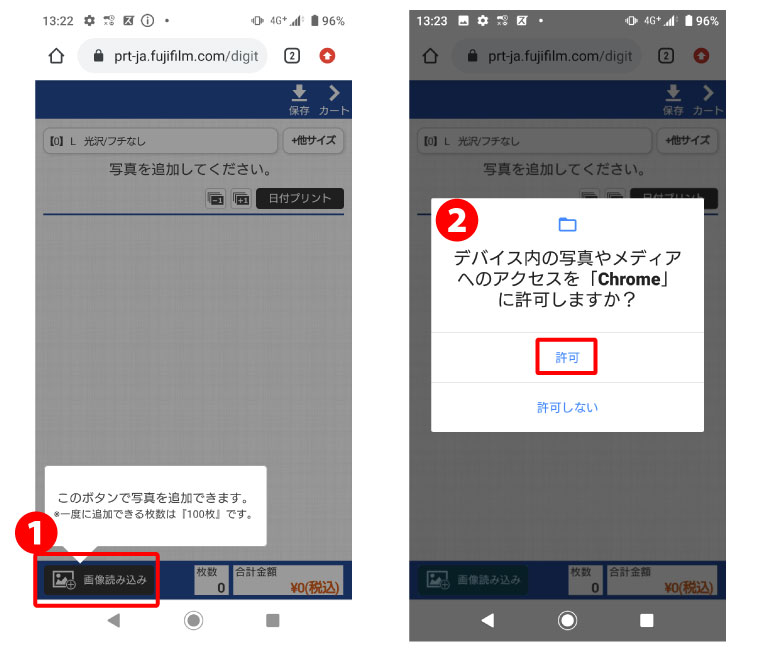 ❷初めてのご注文の際は、ブラウザからのアクセス許可を促すメッセージが表示される場合があります。「許可」をタップする。