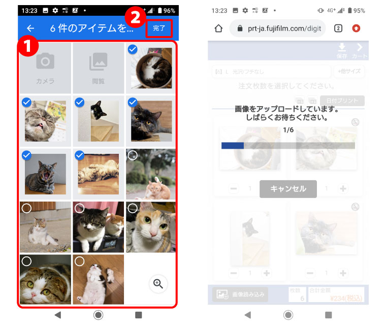 ❶プリントしたい全ての画像をタップし、❷「完了」をタップする。