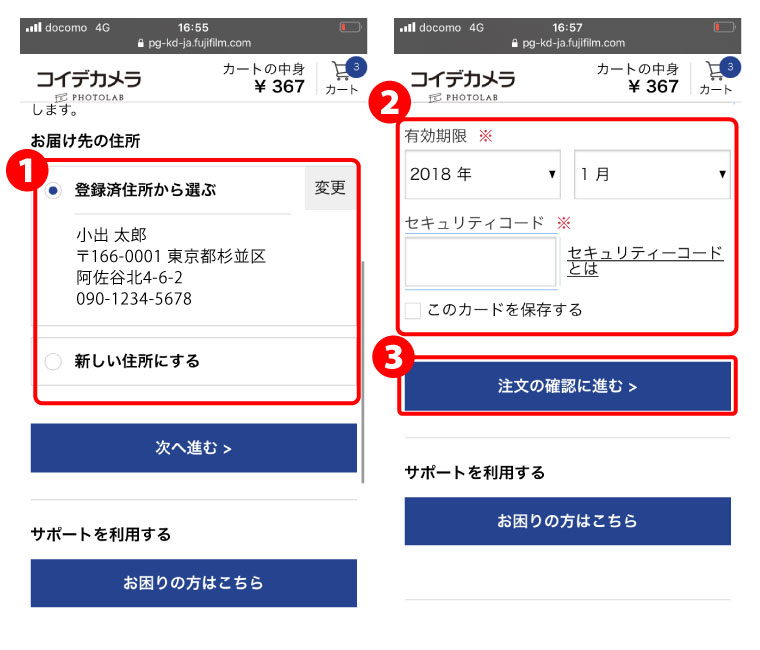 ❷お支払い情報の入力、❸「注文の確認に進む」をタップ。