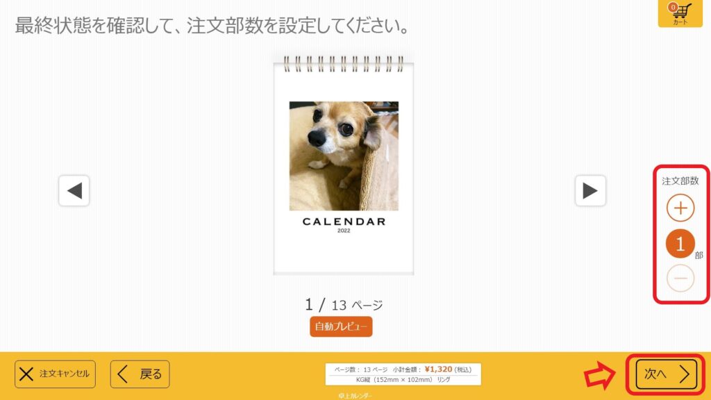 ① 画面で最終状態を確認して、注文部数を設定