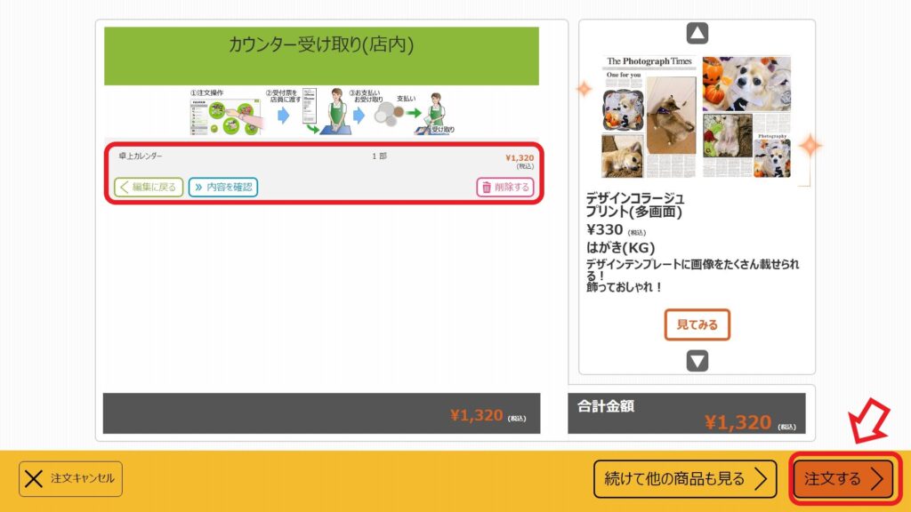 ①注文内容を確認して「注文する」をタッチ