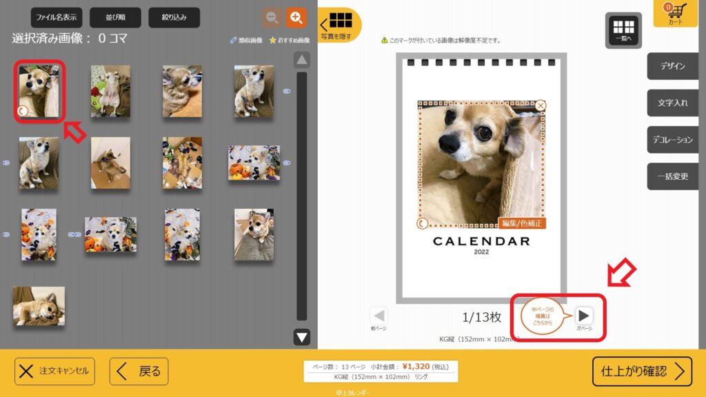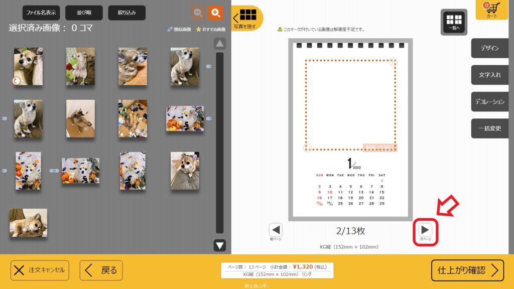 ③中ページの画像を左側の写真から画像を選ぶ ④画像を選んだら「次ページ」をタッチして残りの月の画像を選ぶ