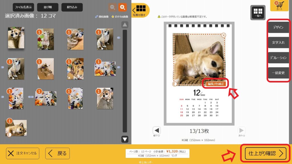 ⑤画像の編集、文字入れ、デコレーションがあれば作業 ⑥作業が終わったら「仕上がり確認」をタッチ