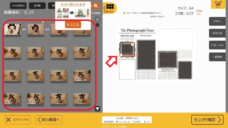 ① 点線のコマに配置したい画像を左側の読み込んだ画像の一覧から選択してタッチする