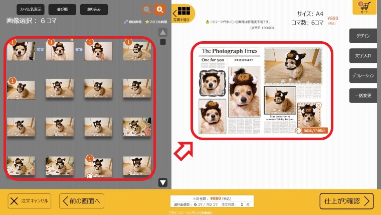 ④右側のデザインコラージュの画像の全てのコマに画像を配置する