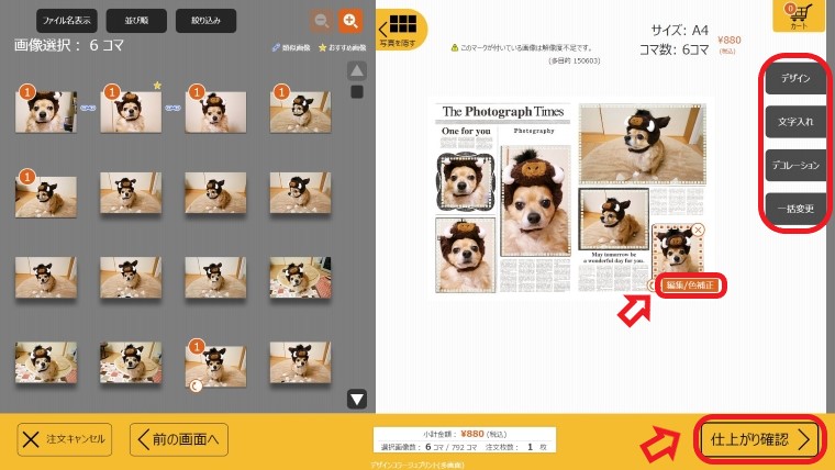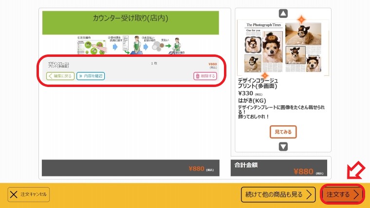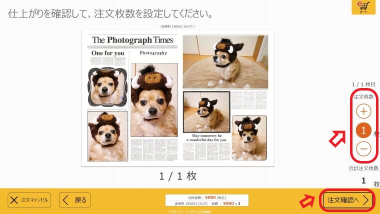 ⑧仕上がりを確認して注文枚数を設定する ⑨注文確認へをタッチする
