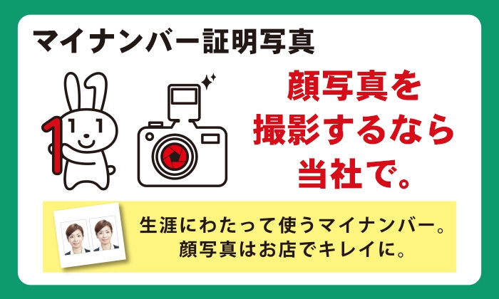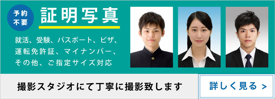 ご予約不要。就活、願書用、マイナンバーカード、パスポート、ビザ申請の撮影など、各種証明写真のサイズを承っております。