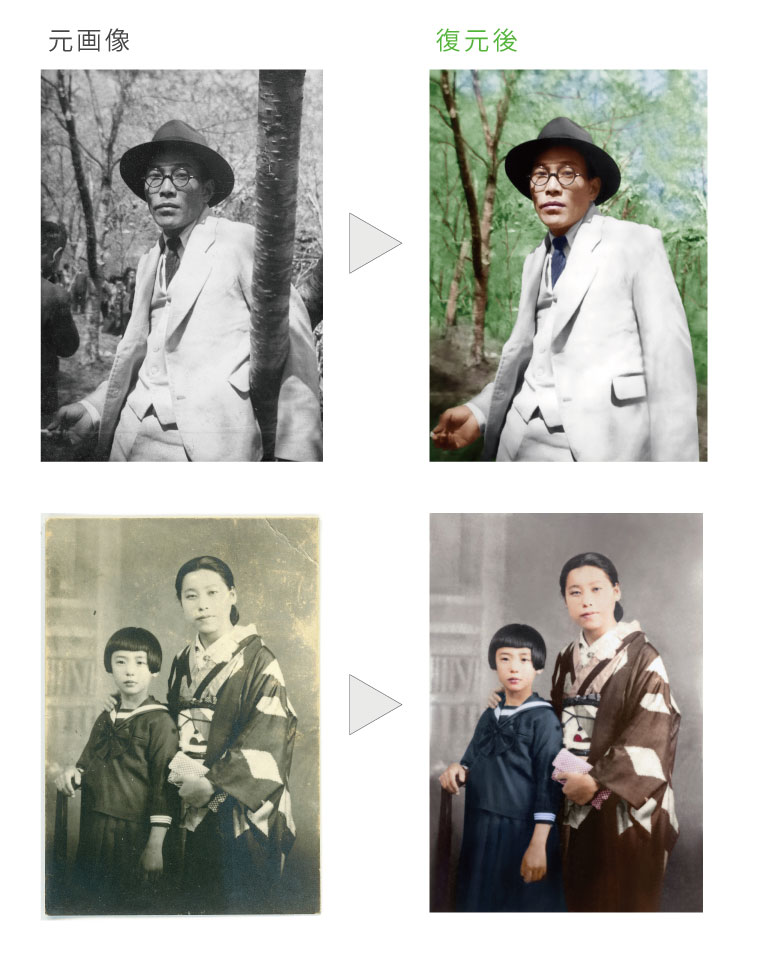 白黒写真をスキャンして画像データを補正、修整します。当時の記録などから色を再現するので思い出を鮮やかに残すことができます。
