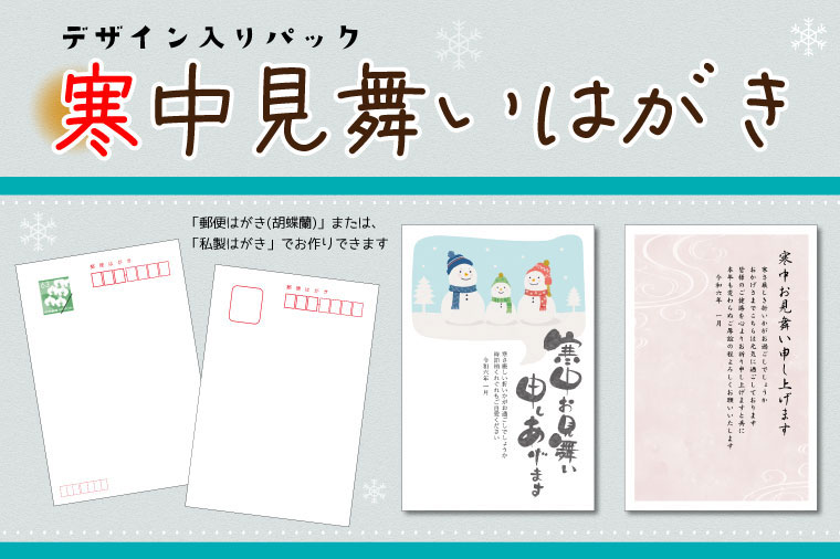 数枚だけ送りたい。 それぞれ絵柄を分けたい方向けに、小枚数のパック寒中見舞いはがきをご用意しております。
